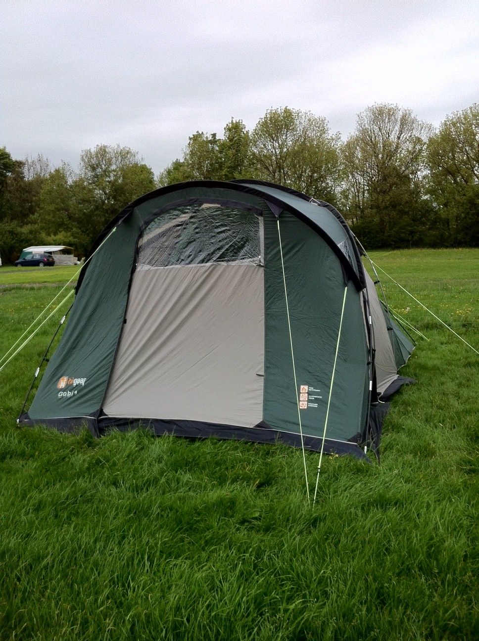 Home from work, change clothes, pack car, drive a whole 50 minutes up the M65 to Salterforth, which is to be our home for the next 2 days. It’s grey and a bit breezy. We’ve not put the tent up for nearly twelve months, so it all becomes a bit haphazard. I fling tent parts around with wild abandon, while Ginge is methodical and organised with his conventional approach of putting the groundsheet under the inner tent and using pegs to stop it flying away…. Once it’s up and everything’s inside, we nip to the shop to pick up things that we’ve forgotten (something of a tradition when we go away), come home, have tea and a glass of wine before settling down to our first night on the air mattress.