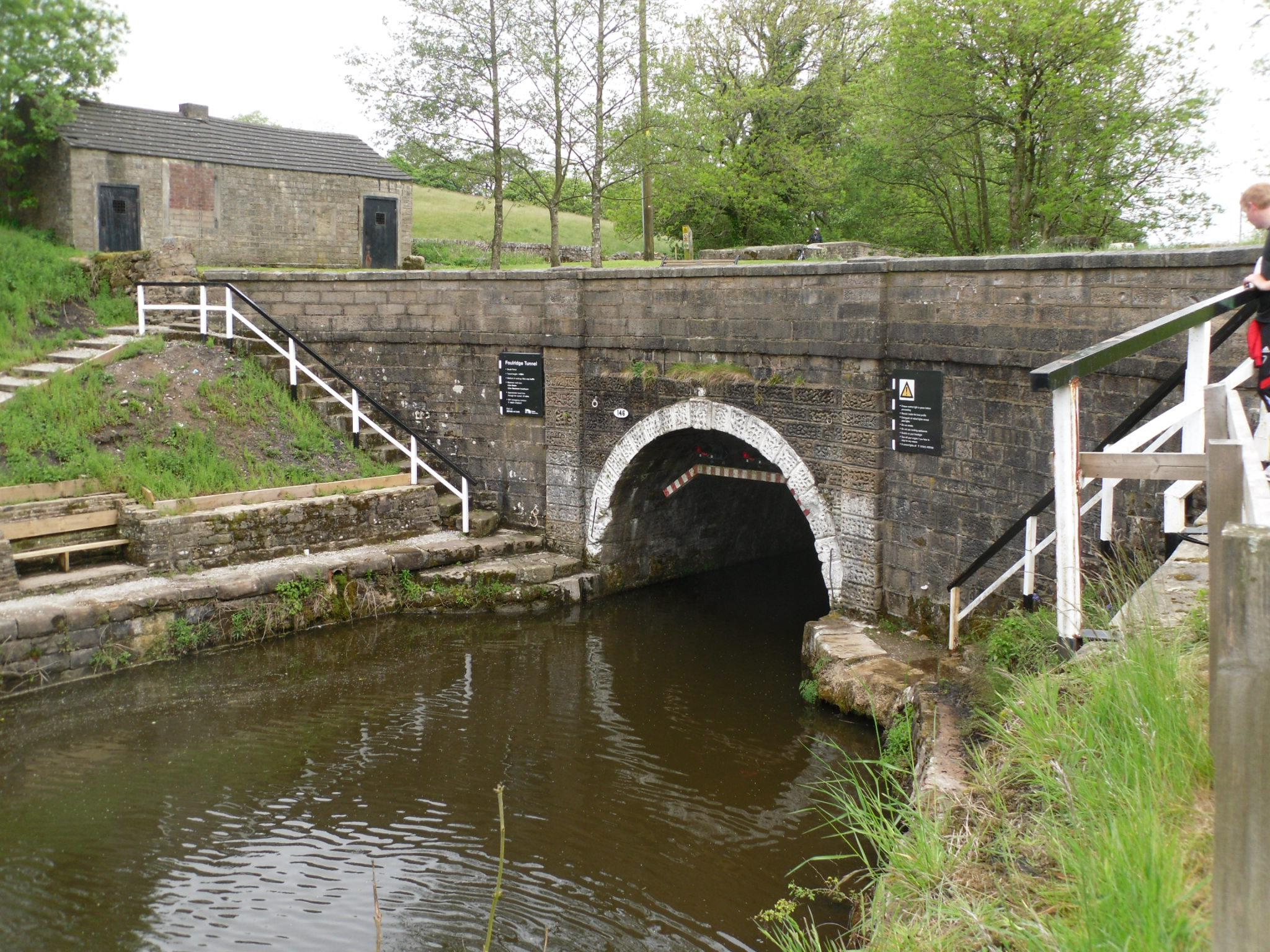 The Foulridge Tunnel is a mile long and is at the summit of the canal. There is no towpath through the tunnel – barges would have been pushed through by the crew lying on their backs and ‘legging’ the boat along the tunnel’s roof (until the advent of steam tugs). In 1912 a cow fell in the canal, swam through the tunnel, emerged the other end and was revived with some brandy at a local pub. The cow’s name was Buttercup.