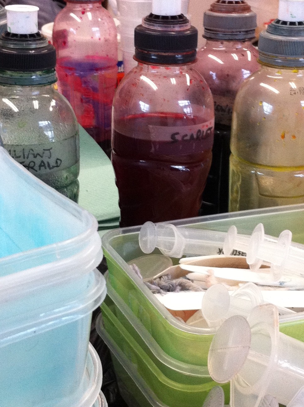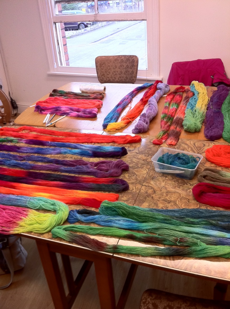 In the afternoon it was time to get our hands on our own projects and have a play with different techniques; mixing colours, dipping, painting or randomly squirting. The first two attempts were on 50g skeins of 4ply pure wool and then onto a final project with a yarn of our choosing (I went for a 4 ply alpaca/acrylic blend – I’m drawn to lighter weight yarns despite not really knowing what to do with them).