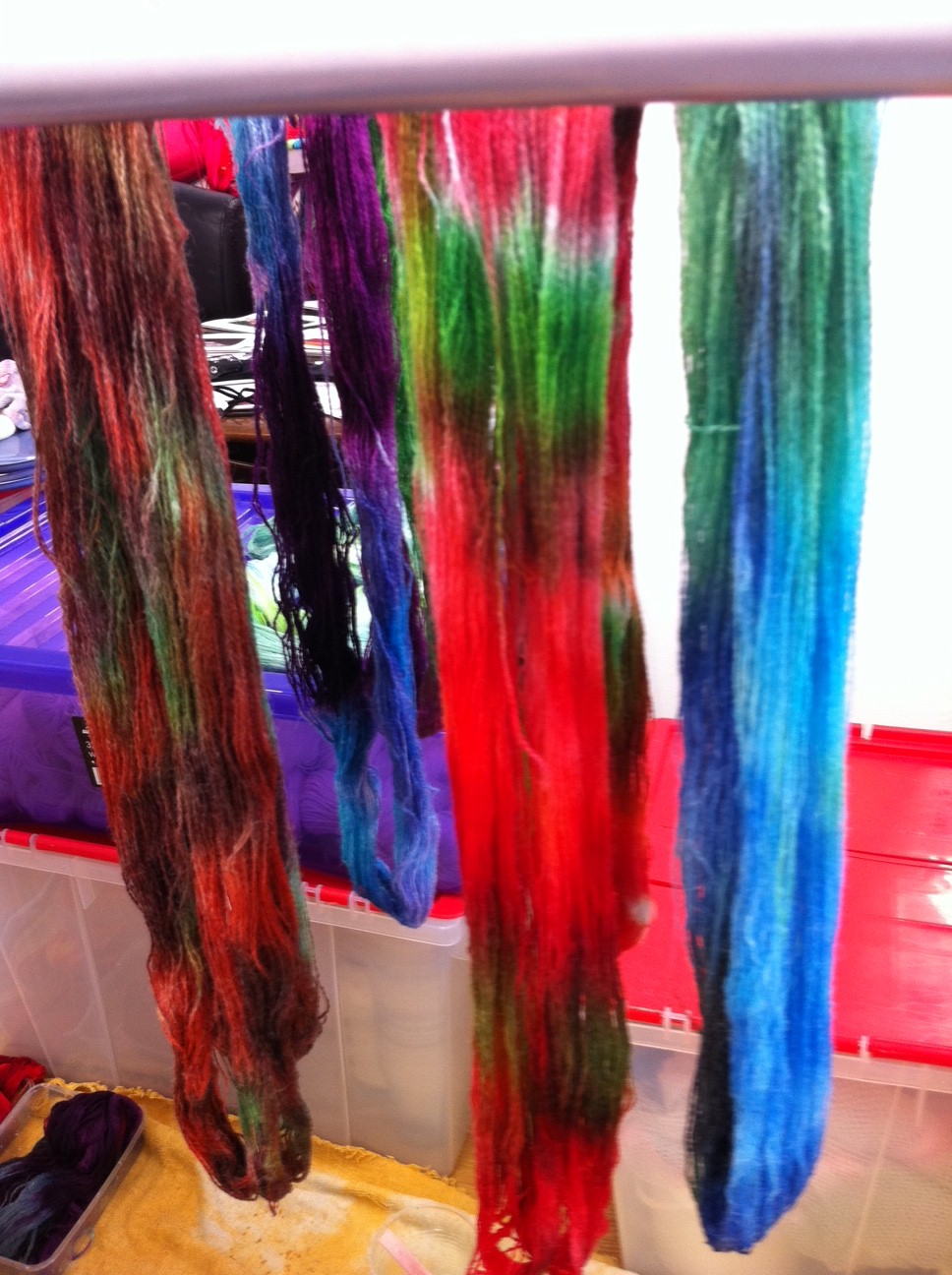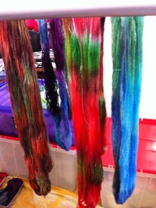 After the yarn is dyed, it goes in the microwave to fix the colour, then is cooled, rinsed and dried.