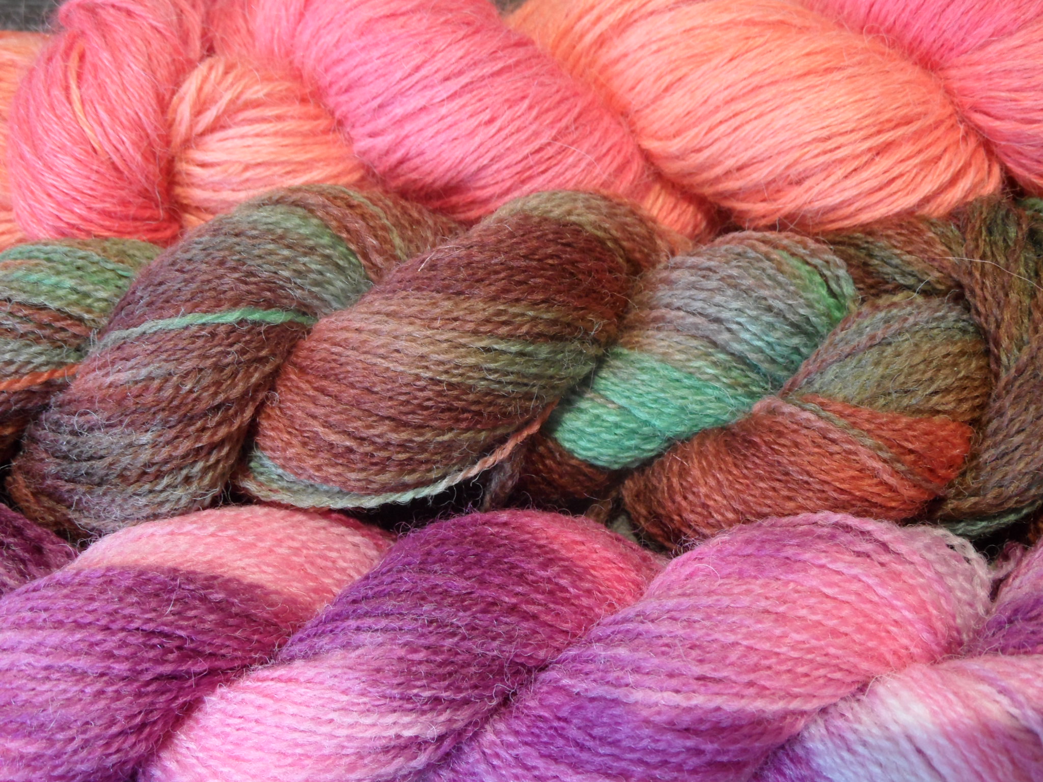 One of the lovely things about taking a course like this is that even if you’re disappointed with your end results, other people can always see something special about the work that you’ve done and it makes you look at it with fresh eyes. At the end of the day, I invested in one or two items from the shop and returned home with three bags of slightly damp yarn, which were then hung up over the bath. They now look like this – I’m really pleased with them (if nothing else, it proves that wool always looks nicer in a skein) but have no idea what to knit them up into.