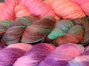 I was a little more brave on my second skein, sponging wide bright and paler pink stripes and interspersing these with thinner stripes of purple.