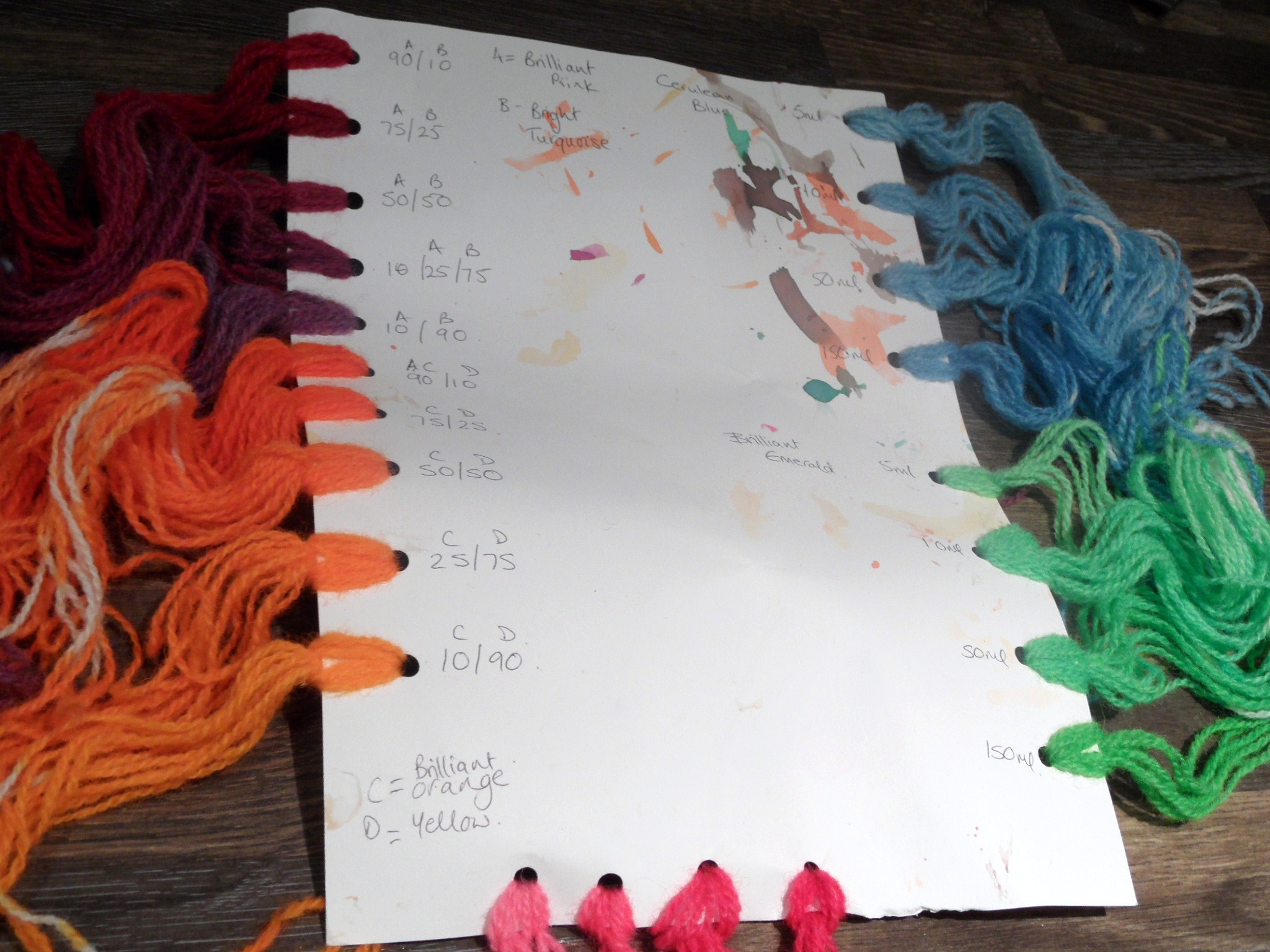 The course was taught by Debbie Tomkies of DT Craft and Design and covered the basics of dying yarn with Procion dyes. Debbie is incredibly knowledgable and brought a gorgeous array of samples and patterns for our inspiration. The morning was spent getting to grips with the effects of changing the concentration of dye and mixing the ratios of different colours in order to make a sample card.
