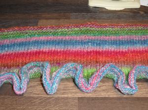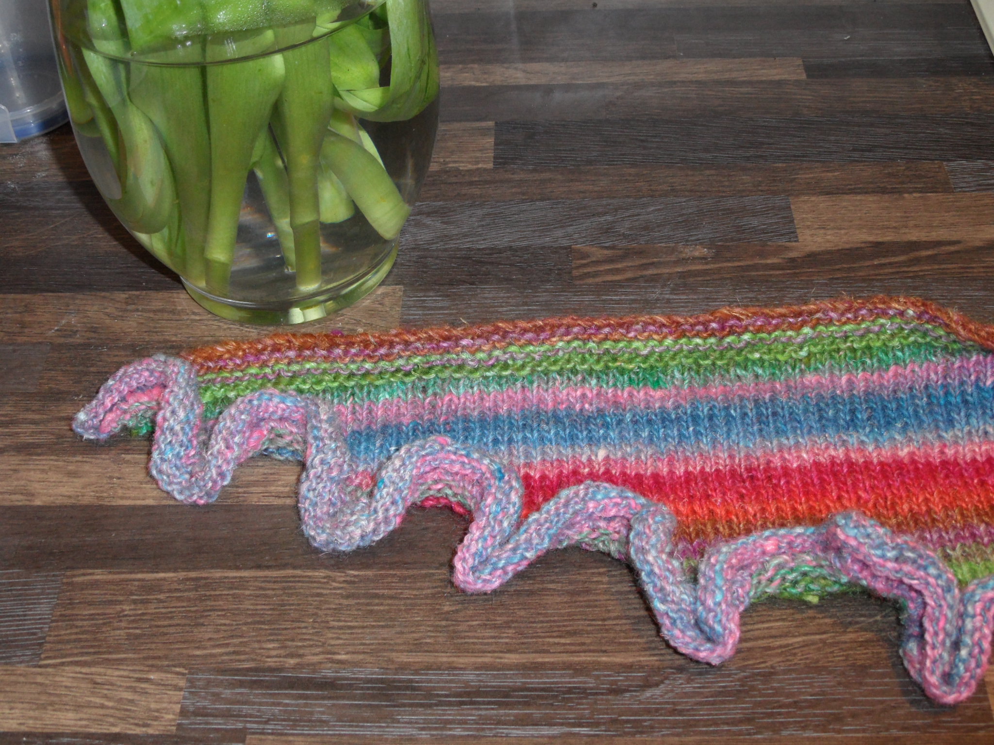 The official name for the wibbly wobbly scarf is Just Enough Ruffles and is available on Ravelry (caution – Ravelry will steal time from you if you like anything woolly). It’s my first attempt at knitting anything long on circular needles (I’m a proper convert to knitting on Knit-Pro needles) – I’ve knitted shorter things on them, but have always been intimidated by a pattern that starts “cast on 200…”.This scarf is knitted lengthways and starts with the words “cast on 200”.