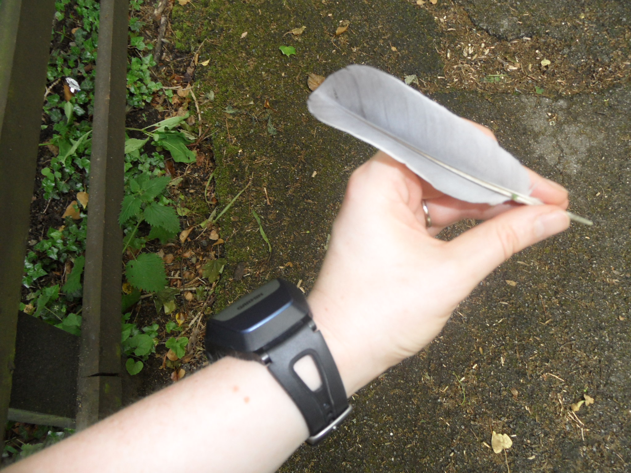 …which was suggested by Fortnightflo, and was only outdone by what I found as I embarked up the final steep hill – an even better feather, which I tucked into my camera and carried all the way home.