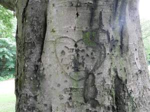 Off I trotted, optimistically seeking a half eaten Greggs or someone’s dropped treasure, but unfortunately the locals are too frugal to waste pastry or spare change. I made my way up to the park, getting some slightly odd looks as I darted from tree to tree looking for one from my list. I didn’t quite find Jo’s a tree with someone’s name carved in, but this one did have a declaration of love so I think that counts.