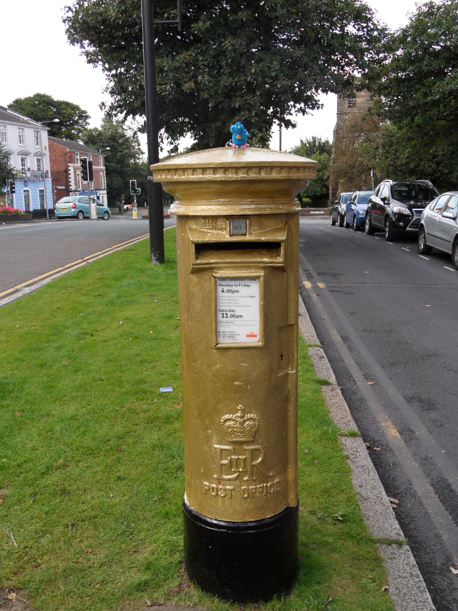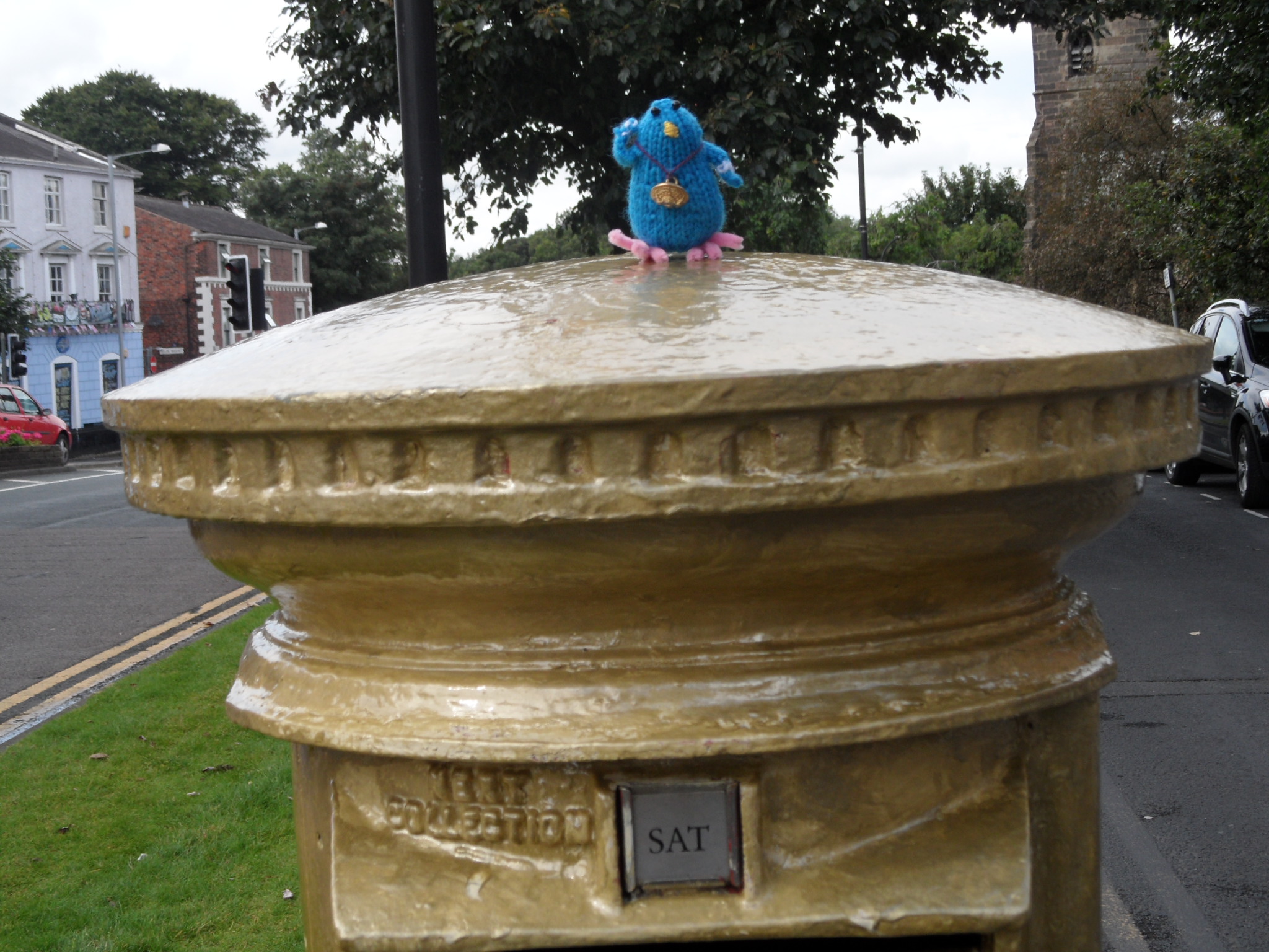 So how to get into the Olympic spirit even more? Well, with a visit to Bradley Wiggins’s actual golden postbox with Stan the knitted pigeon, that’s how.