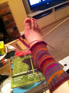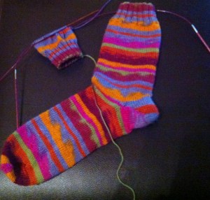 Oh, and having learned to love magic loop, I went to my nearby lovely wool shop to get some 2.5mm needles only to find that they were out of the long length that I would need. The end result of this is that the owner showed me yet another technique that I had never understood in the past – how to knit in the round using two short circular needles. I did suspect that this may be a ruse to sell me twice as many needles, but it’s so easy that I have actually finished my sock!