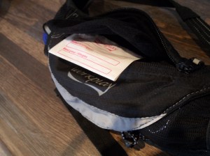 This also took a bit of getting used to and at first I had to stop to fettle the bottle out of its net, but after a few goes I got the hang of releasing it on the move. There is no bouncing or rattling from anything in the bag (because of the fleece inner pocket) and there’s even an In Case of Emergency label in case you should encounter any misfortune.
