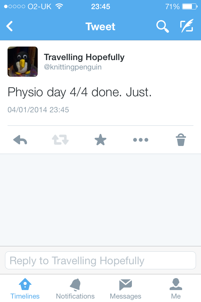 Oh, and I did do my physio exercises before the midnight cut-off, but I’m still a set behind because I’ve only just eaten and Sherlock’s on in a bit.